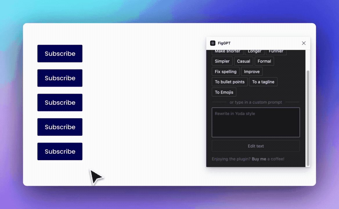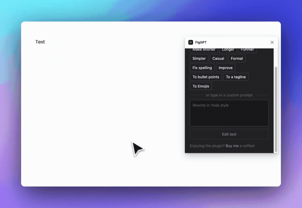 Allows you to modify existing text layers in Figma by selecting text layer and clicking one of the available styles, shorter, longer, funnier, simpler, casual, formal, fixed spelling, improve, bullet points, tagline, or emojis.