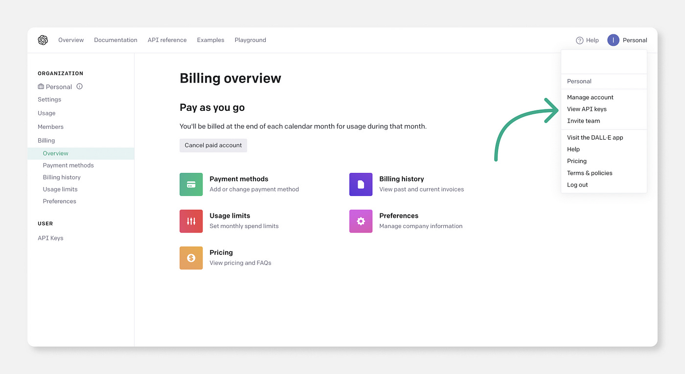 After opening it, you should add your email and API key. You can generate the API key from the OpenAI website by clicking on “Personal” in the header and then clicking on “View API keys.”